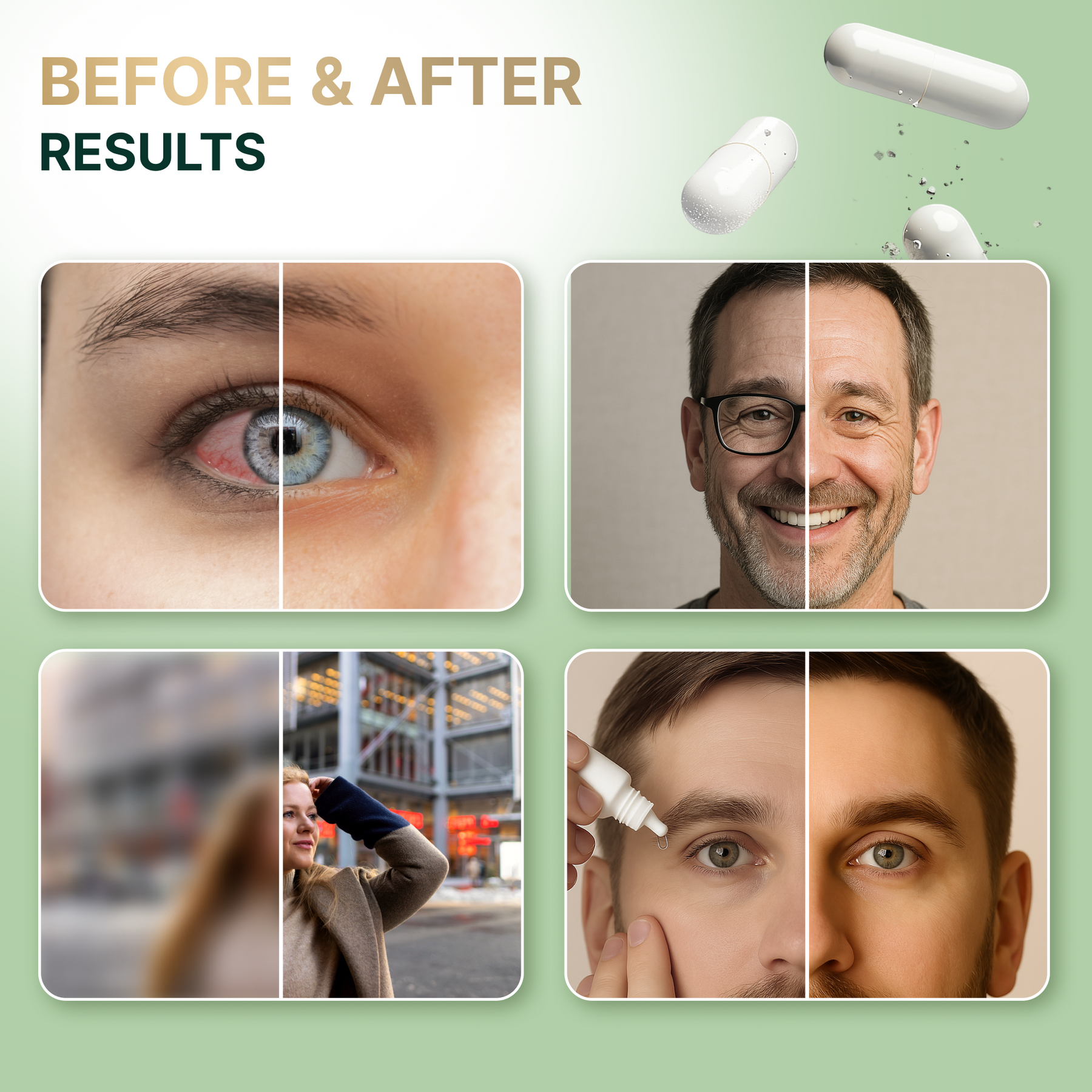 Take 2 capsules daily with a glass of water. The nutrients are gently absorbed to hydrate your eyes, reduce strain, and protect against age-related damage. Within a few weeks, many notice less dryness, improved clarity, and greater comfort. Consistent daily use helps support long-term eye health and visual sharpness.